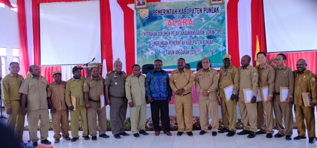 ILAGA - Bupati Puncak Willem Wandik,SE,M,Si, menyerahkan Dokumen Pelaksanaan Anggaran (DPA) Kepada OPD (Organisasi Perangkat Daerah) di Lingkungan Pemerintah Kabupaten Puncak, sebanyak 50 DPA yang diserahkan kepada OPD di Kabupaten Puncak, berlangsung di Gedung Serba Guna (GSG) Negelar, Ilaga, Kabupaten Puncak, Senin (22/1),kemarin.