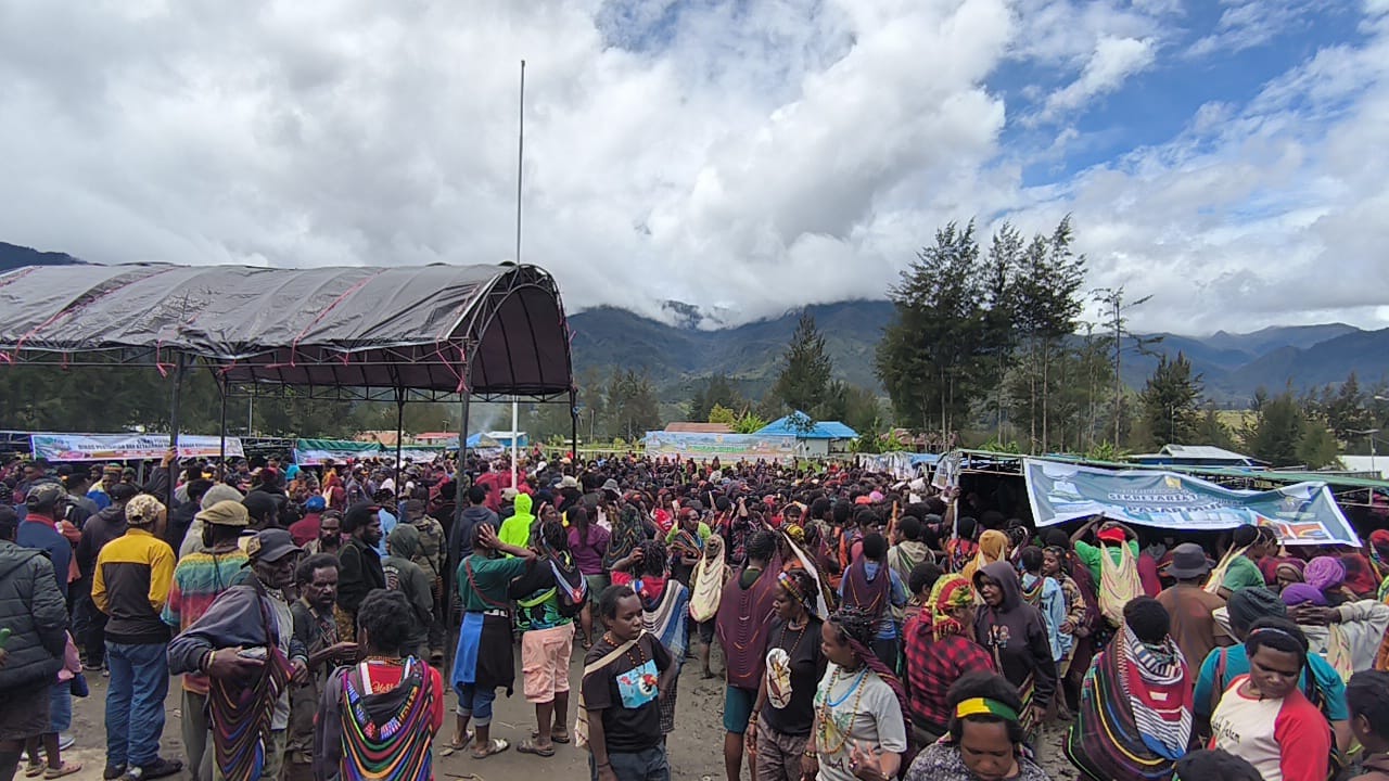 ILAGA - Ribuan warga Kabupaten Puncak, terutama yang berada di sekitar Distrik Ilaga, Gome dan sekitarnya, menyerbu pasar Murah yang diadakan oleh Pemerintah daerah Kabupaten Puncak, melalui Dinas Pertanian dan Dinas Ketahan Pangan, pasar Murah ini merupakan Komitmen dari Penjabat (PJ) Bupati Puncak Nenu Tabuni untuk menekan tingginya harga inflasi daerah. Pasar Murah ini dibuka oleh PJ Bupati Puncak Nenu Tabuni,di Lapangan Trikora Ilaga, Sabtu 31 Agustus 2024.