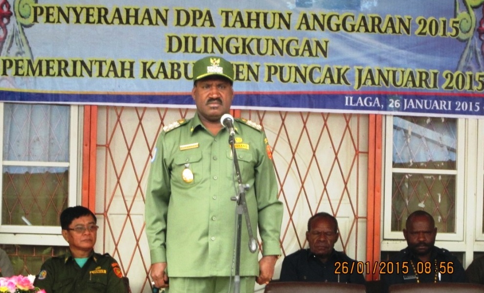 (Ilaga, 26/01/2014) Bupati Puncak Willem Wandik, S.E., M.Si membagikan DPA (Dokumen Pelaksanaan Anggaran) Tahun Anggaran 2015 kepada Kepala-Kepala SKPD selaku KPA (Kuasa Pengguna Anggaran). Acara yang dilaksanakan di halaman Kantor Bupati selepas apel pagi rutin Senin tersebut dihadiri oleh pejabat-pejabat daerah diantaranya Ketua DPRD Terpilih, Asisten Sekda, Staf Ahli dan juga para staf di lingkungan pemerintahan Kabupaten Puncak.