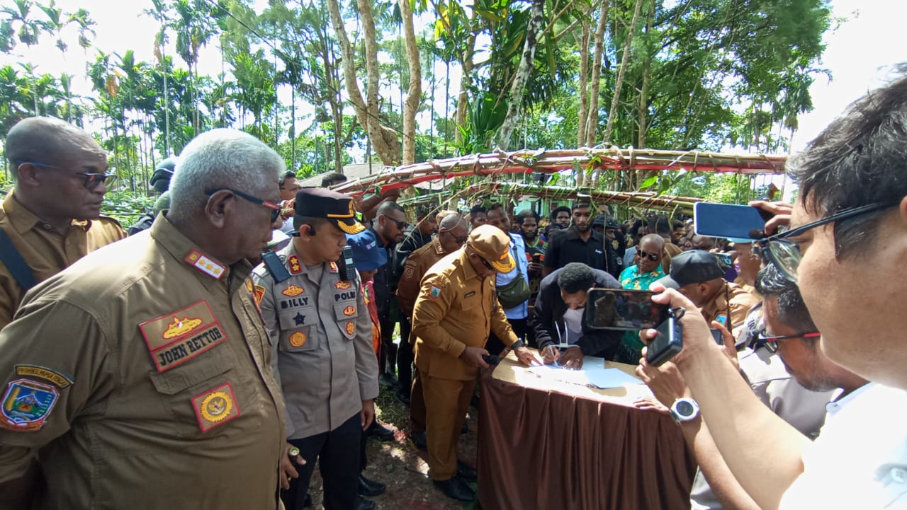 Kesepakatan damai yang ditandai dengan ritus belah kayu, patah panah, tukar babi, dan saling kunjung antarkedua kubu sebagai simbol rekonsiliasi ini, dihadiri Wakil Bupati Puncak Naftali Akawal, SE,MM, didampingi Penjabat Sekretaris Daerah Nenu Tabuni, S.Sos dan Kabag Ops Polres Puncak AKP Hary Katang.