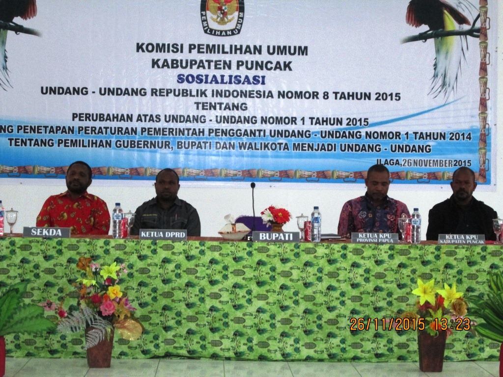 (Ilaga, 26/11/2015) KPU Kabupaten Puncak mengundang sejumlah Komisioner dan Narasumber dari KPUD Provinsi Papua untuk memberikan sosialisasi UU Pilkada Nomor 8/2015 di Aula Negelar pada hari Kamis 26 Nopember 2015 pukul 13.00 WIT. Acara yang dihadiri oleh lebih dari 200 peserta tersebut berasal dari berbagai kalangan seperti utusan partai politik, masyarakat, dan stakeholder terkait.