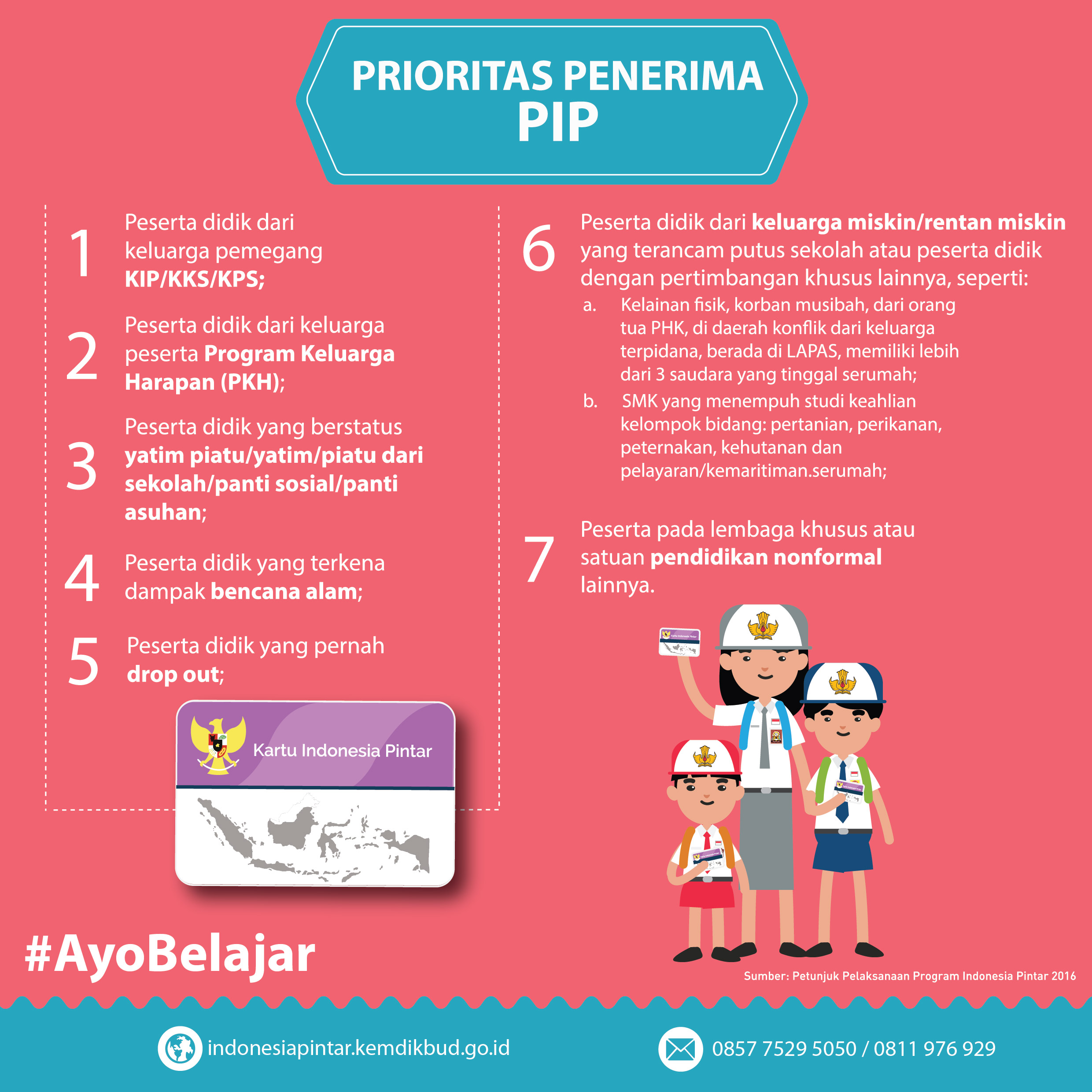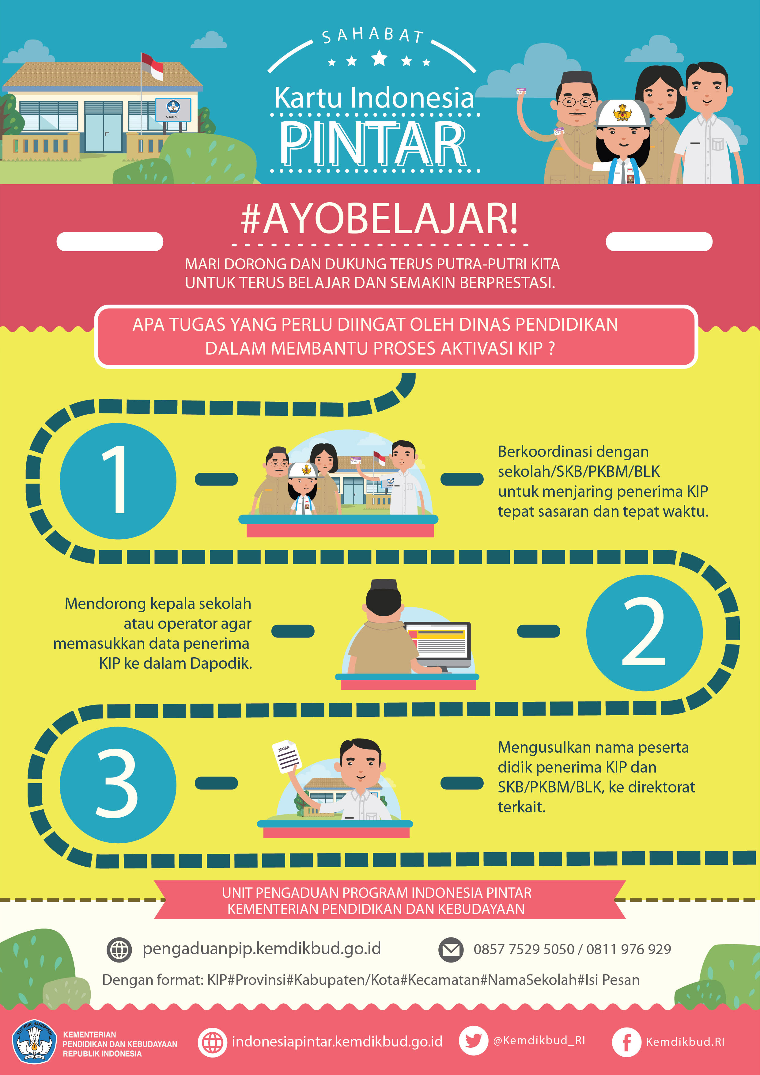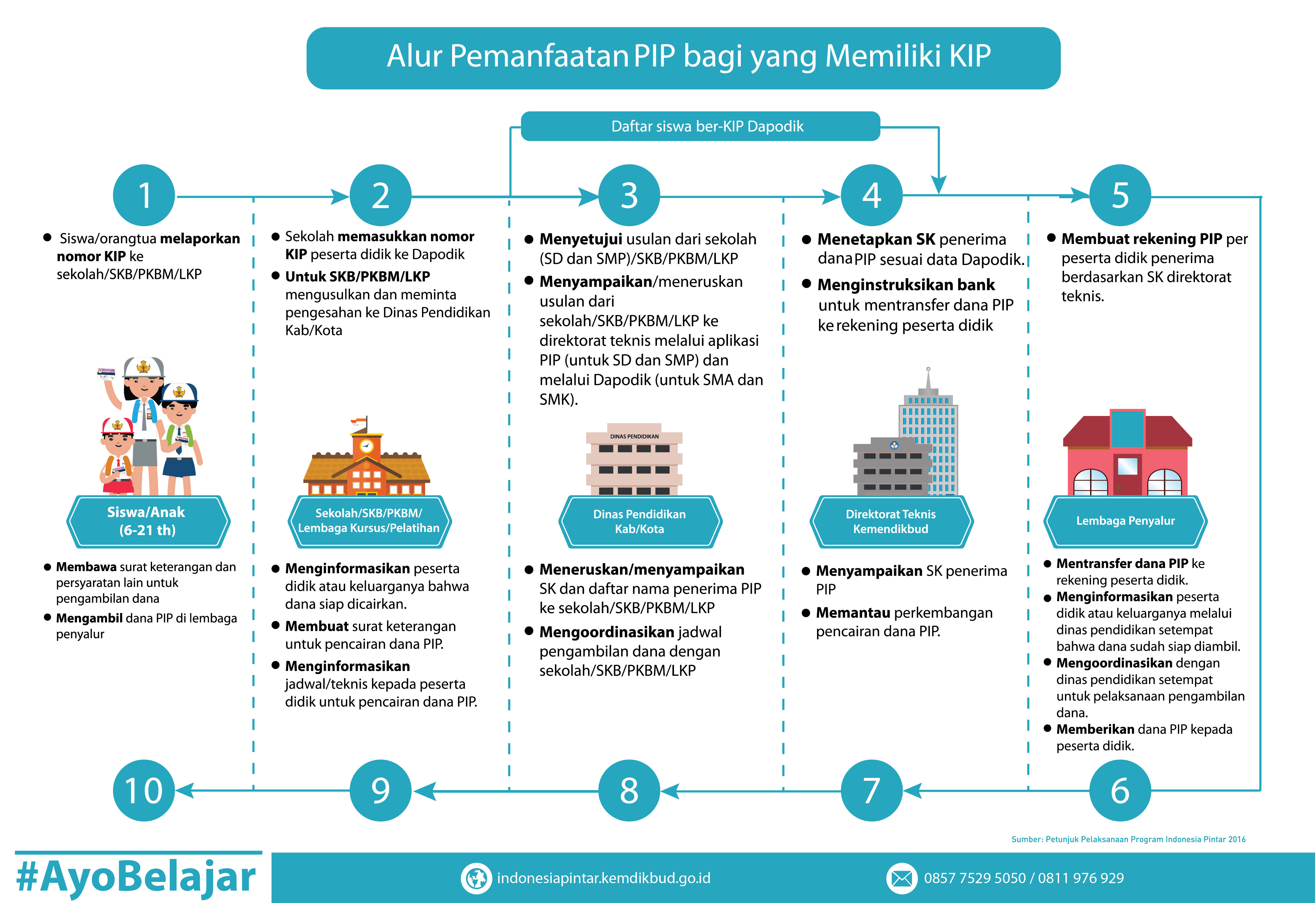 Informasi, pertanyaan dan pengaduan seputar PIP dan KIP dapat dilakukan melalui laman indonesiapintar.kemdikbud.go.id, hotline (021) 5703303, 57903020, SMS 0857 7529 5050 dan 0811 976 929.