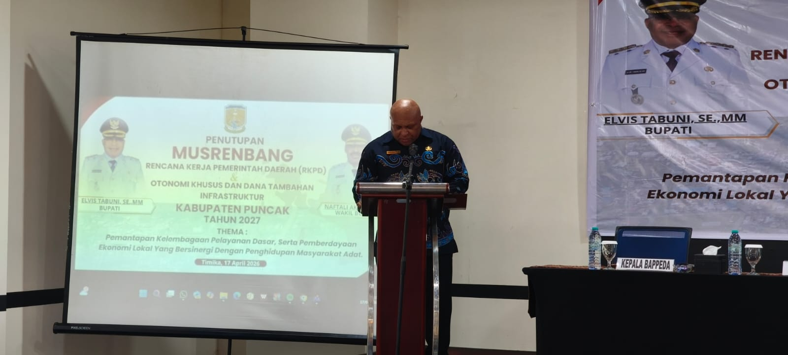 TIMIKA – Wakil Bupati Puncak, Naftali Akawal, SE., memimpin langsung dua agenda strategis pembangunan daerah, yakni Pembukaan Musrenbang Otonomi Khusus (Otsus) sekaligus Penutupan Musrenbang Rencana Kerja Pemerintah Daerah (RKPD) Kabupaten Puncak Tahun 2027. Kegiatan ini berlangsung khidmat di Hotel Horison Ultima, Timika, Jumat (17/4/2026).