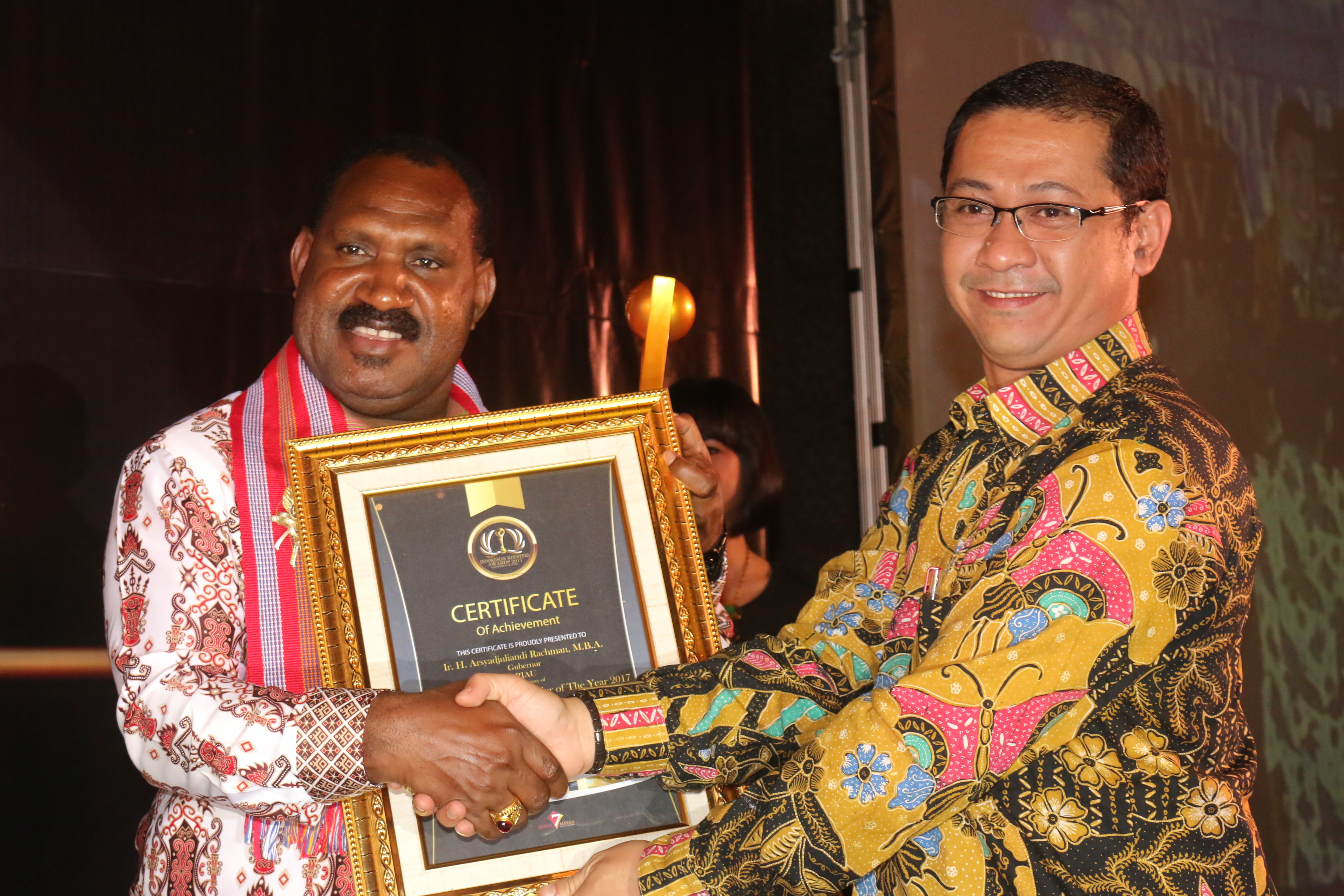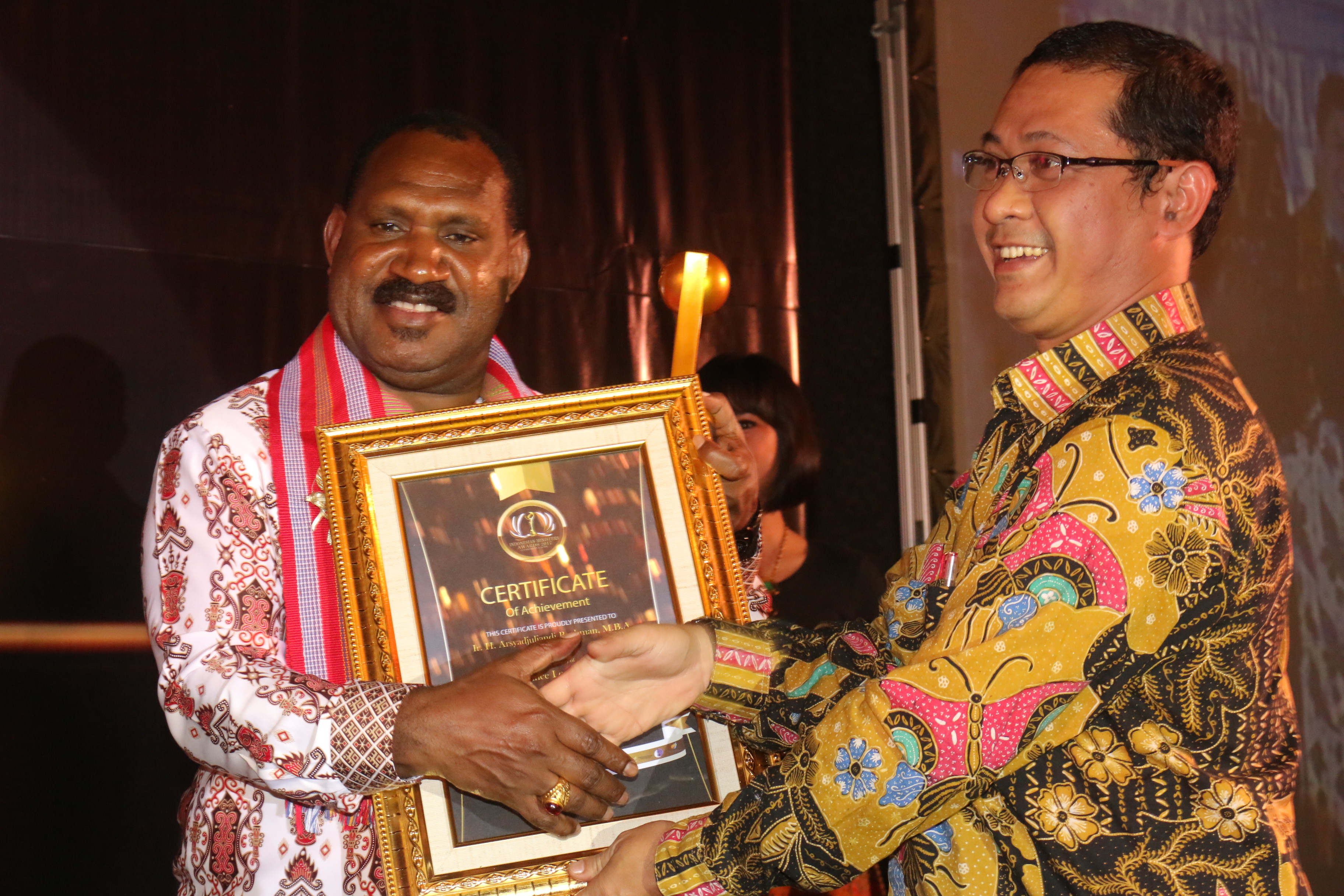 Bupati Puncak, Willem Wandik, SE MSi (kiri), menerima penghargaan 7 Best Regents of the Year 2017 atau 7 Bupati terbaik di Indonesia tahun 2017, dalam acara Indonesian Ministers Awards 2017 “Government and BUMN” yang dilaksanakan di Grand Ballroom The Trans Hotel Bali, Jumat (28/4). Penghargaan diserahkan oleh Kepala Sub Bidang Advokasi Usaha pada Kementerian Koperasi dan UKM, Dery Agus Muslim.